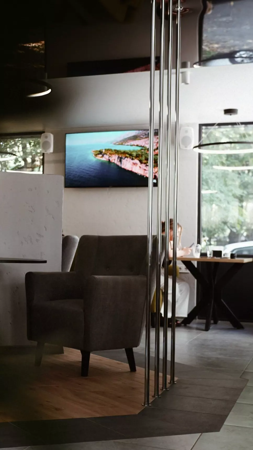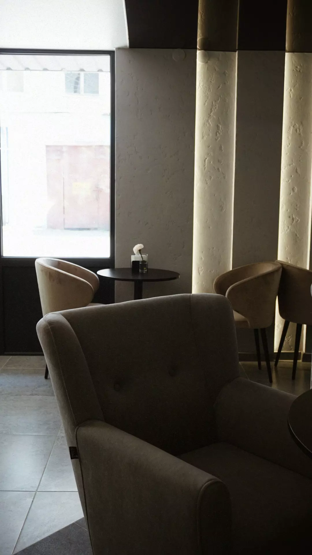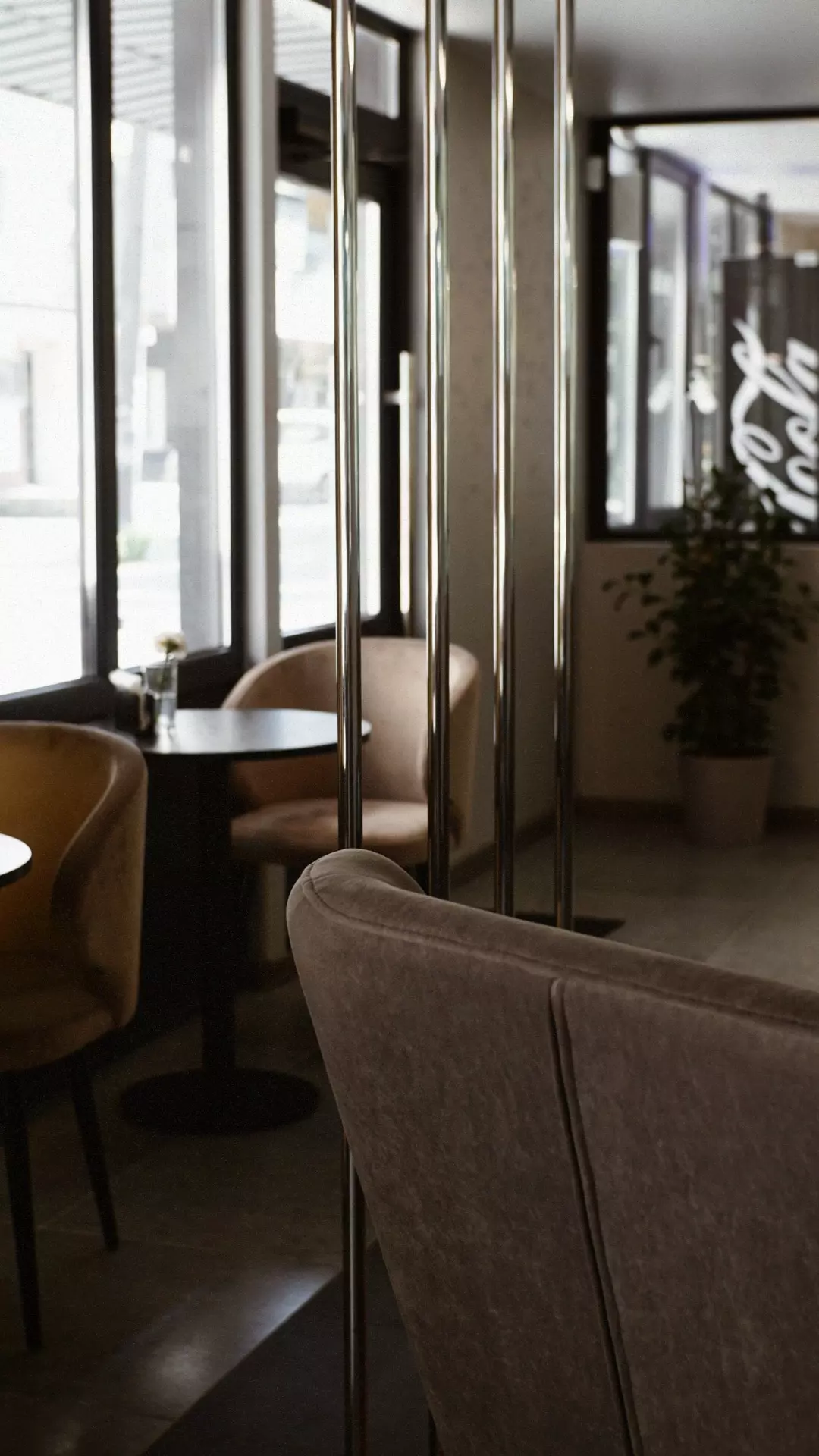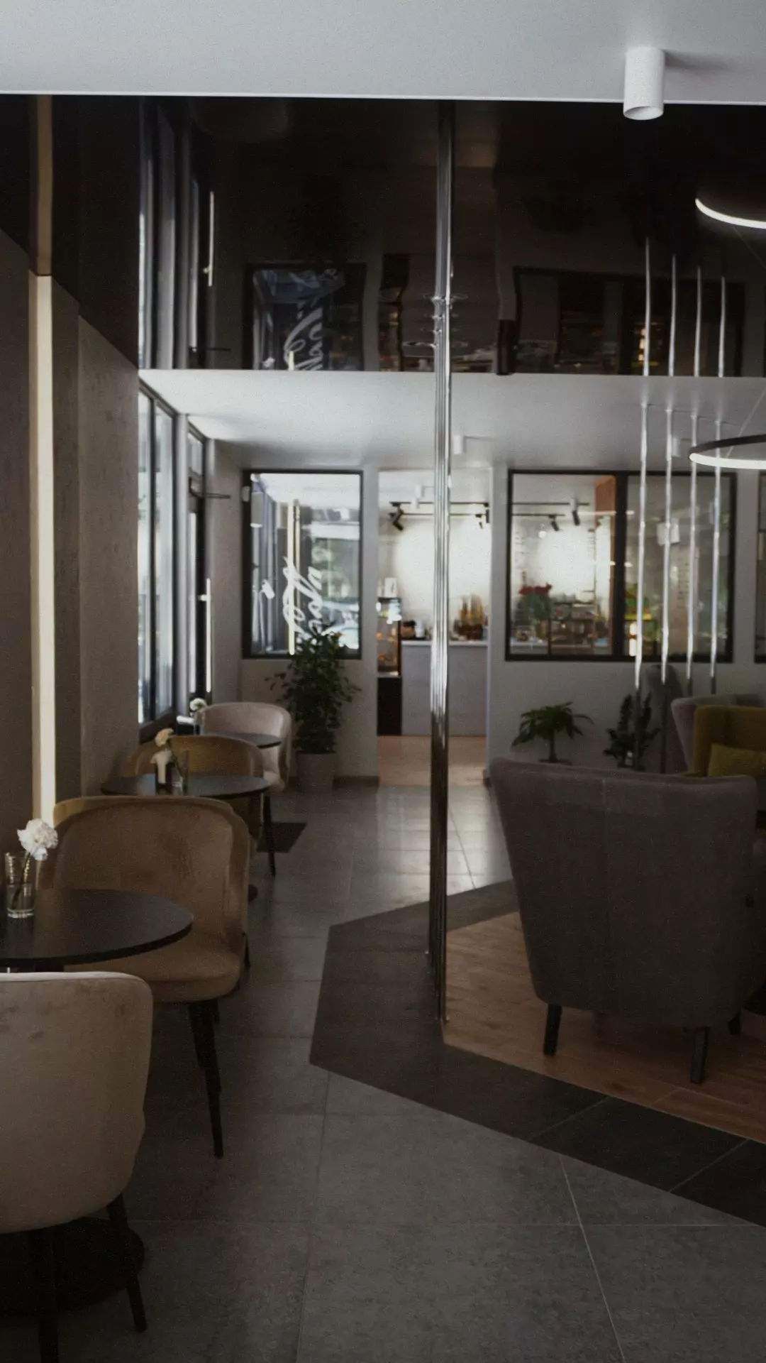 Інтер’єр кав’ярні Daily створений у сучасному лофт-стилі з м’яким, затишним характером. Поєднання текстур бетону, дерева та глибоких відтінків формує комфортну атмосферу для зустрічей і неспішної кави. Простір поділений на зони приватності та відкритої комунікації, а продумане освітлення підкреслює настрій інтер’єру в будь-який час дня.