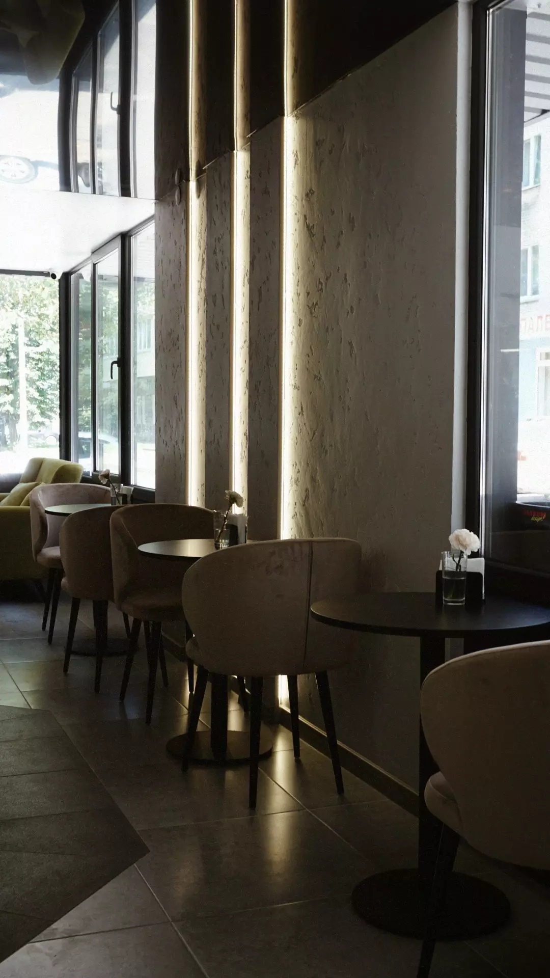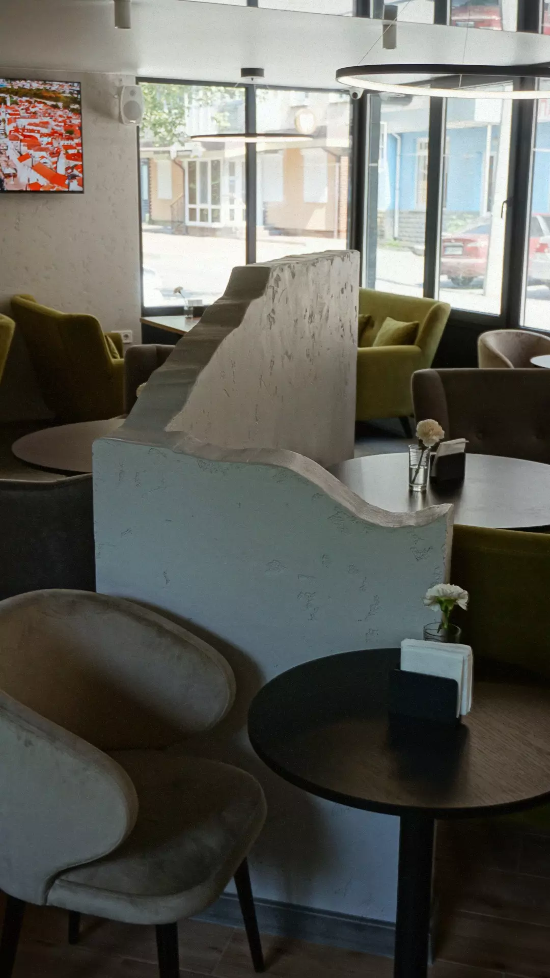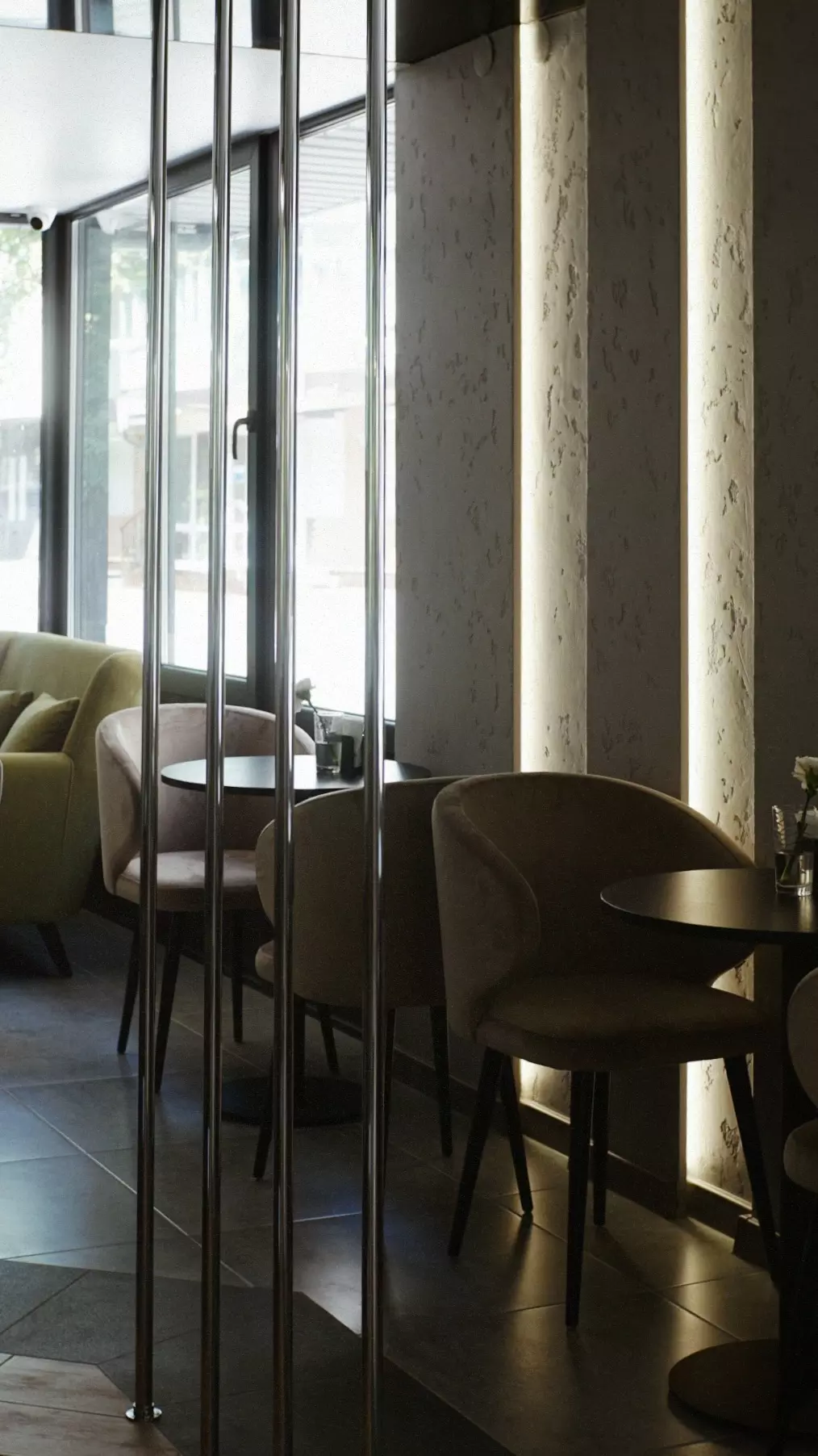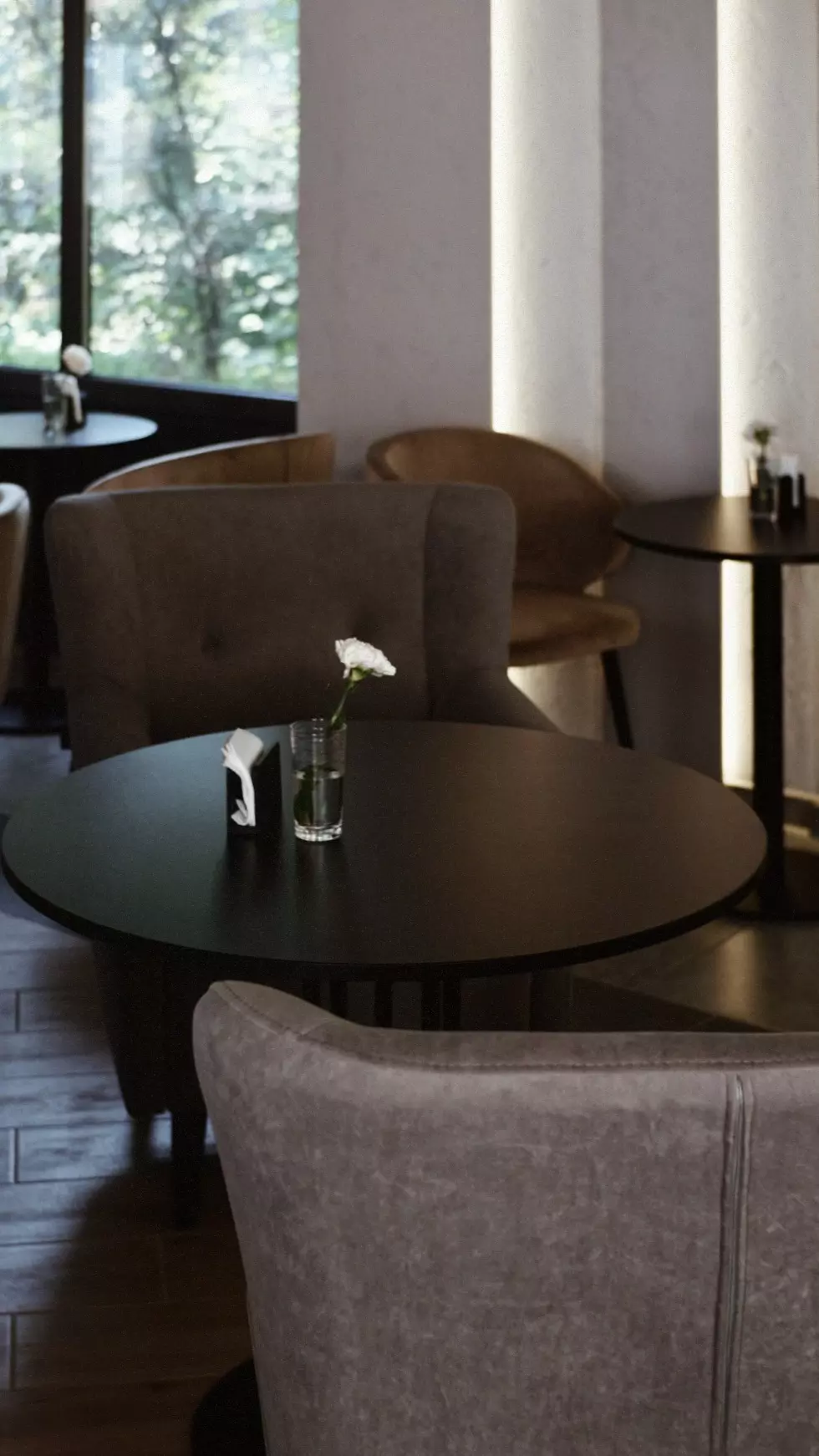 Інтер’єр кав’ярні Daily створений у сучасному лофт-стилі з м’яким, затишним характером. Поєднання текстур бетону, дерева та глибоких відтінків формує комфортну атмосферу для зустрічей і неспішної кави. Простір поділений на зони приватності та відкритої комунікації, а продумане освітлення підкреслює настрій інтер’єру в будь-який час дня.