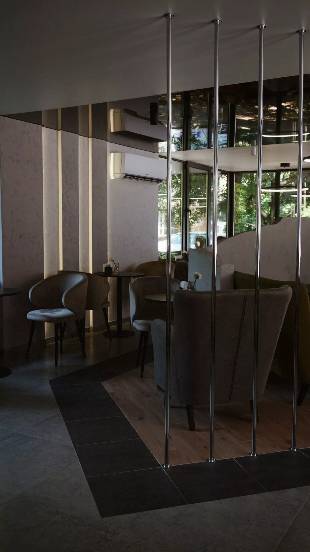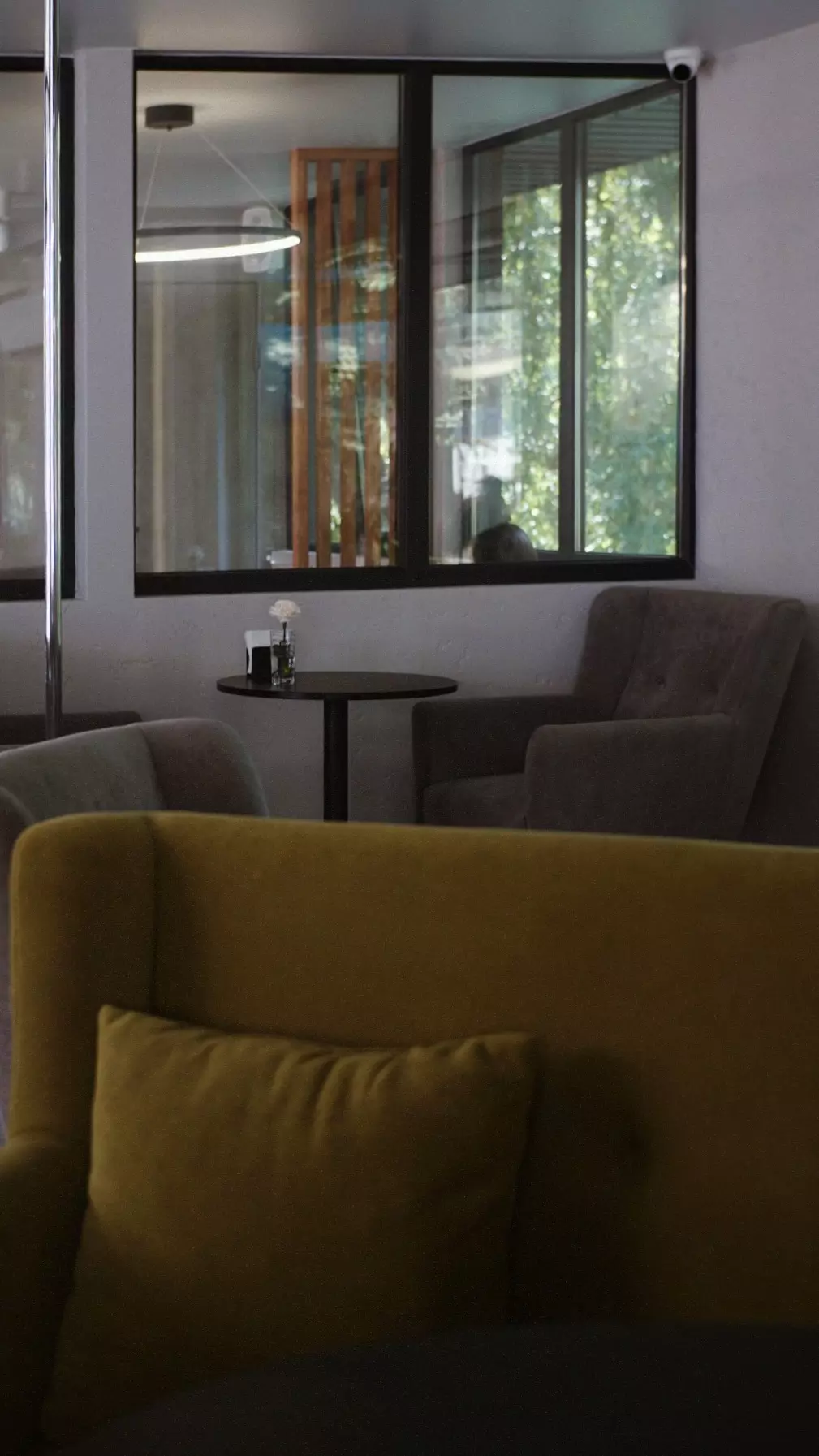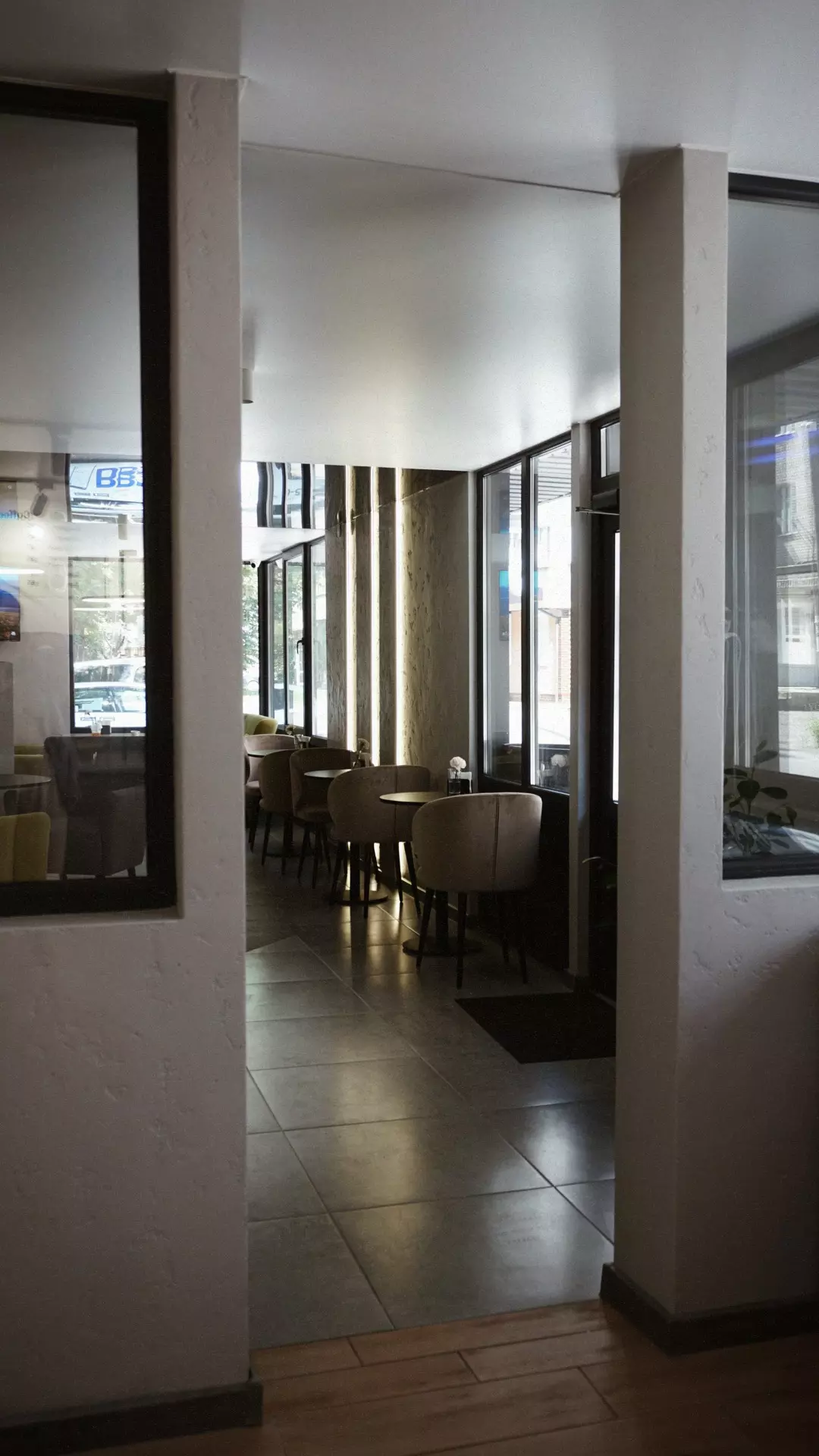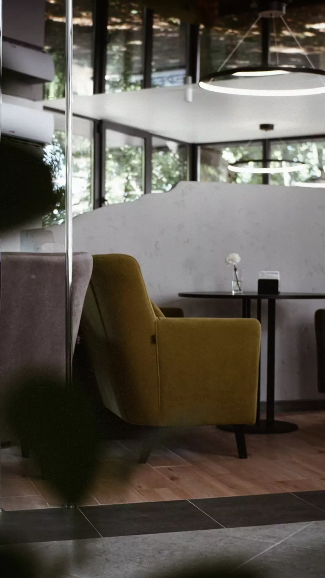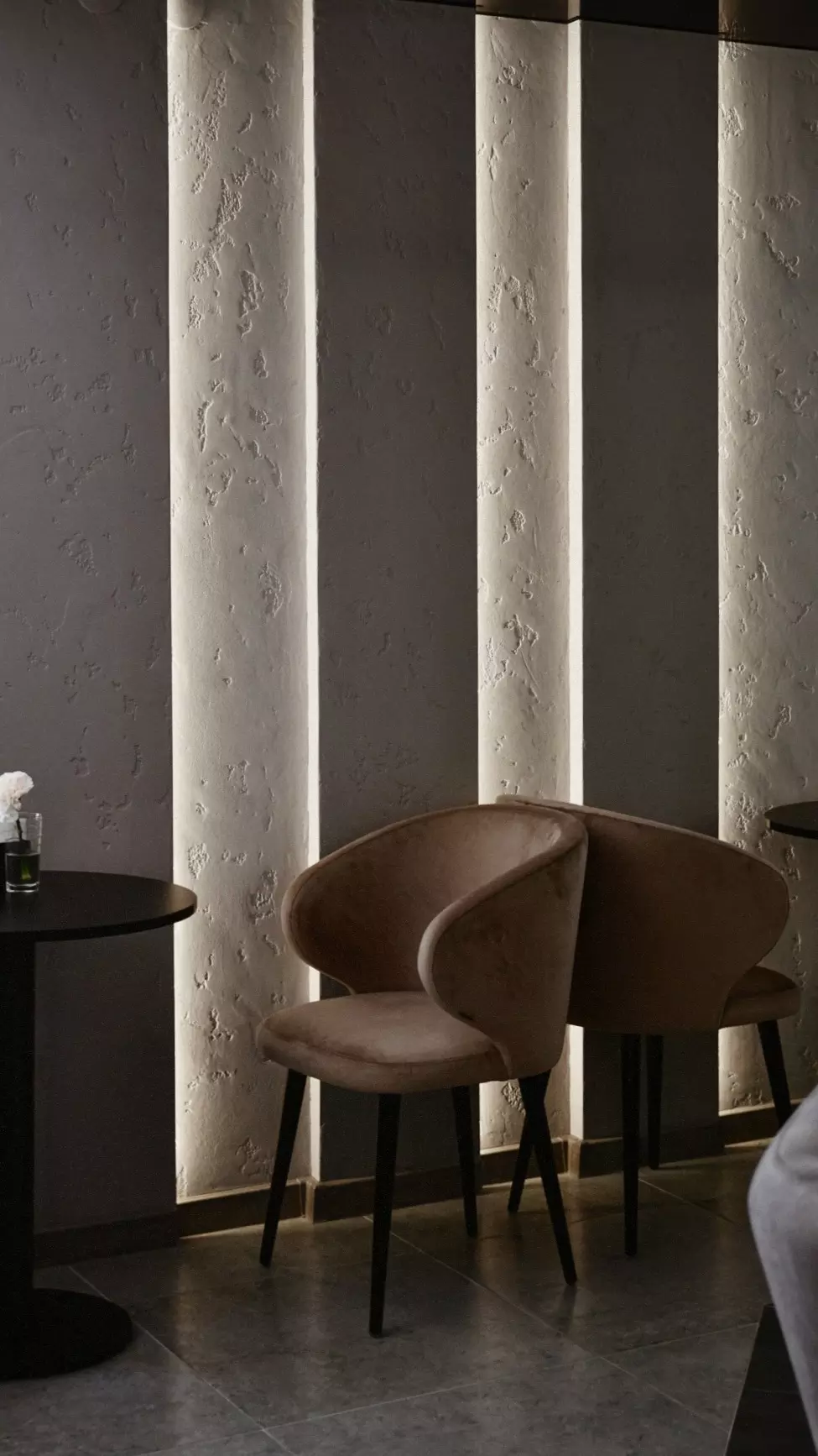 Інтер’єр кав’ярні Daily створений у сучасному лофт-стилі з м’яким, затишним характером. Поєднання текстур бетону, дерева та глибоких відтінків формує комфортну атмосферу для зустрічей і неспішної кави. Простір поділений на зони приватності та відкритої комунікації, а продумане освітлення підкреслює настрій інтер’єру в будь-який час дня.